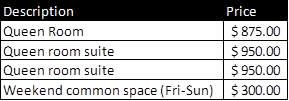 not yet get lodging. Prices range from $300(weekend) to $875.00 for the