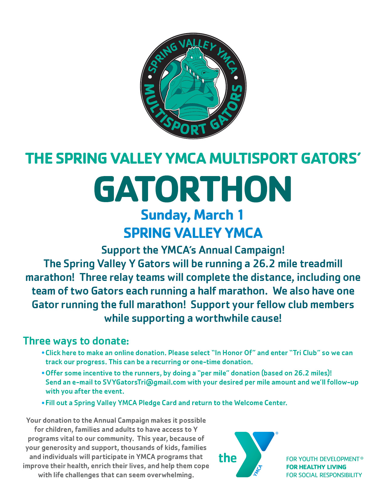 We have a great group of close to 20 club members participating in relay teams this coming Sunday, March 1 as part of "Gatorthon", which will take place on the Y's treadmills starting at 8:15am. We also plan to have an "aid station"... Stop by if you'd like to volunteer at the aid station, which will include...Supplying drinks to the runnersPromoting our clubCollecting any on-site donations